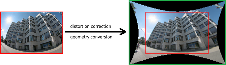 On the left you see the the input image. On the right is the output after applying Lensfun distortion correction and/or geometry conversion. The red rectangle represents the pipe size. The correction/conversion is likely to produce an output image that is larger or smaller than the pipe size dimensions. In our example it is larger (green box). Since Photivo treats the pipe size dimensions as the definite image boundaries, everything outside the red box gets chopped off.