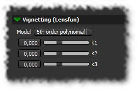 Model sets the mathematical model used to correct vignetting. None means the correction is disabled. Each model has a set of parameters. Those appear as sliders below the combo box and adjust according to the model you choose. The values represent parameters in a (set of) mathematical equations and don’t really have an easily explained individual meaning for the output. Just play around with the values until you are satisfied with the result.