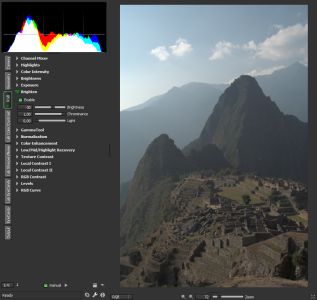 Our first task is to make use of as much of the histogram range as possible to prepare for the following enhancing of every possible contrast. A great filter to achieve this is Brighten (Reinhard tonemapping) on the RGB tab. Brightness controls the overall strength of the brighten effect, Light is useful for fine tuning the brightening, and Chrominance affects how warm or cold colours come out. For more details have a look at the Photivo manual. For our example image Brighten with -30/1/0 settings works well.