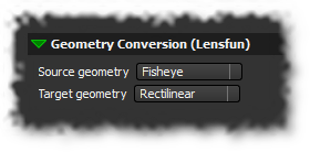 The Geometry Conversion (Lensfun) tool converts between different lens geometries. Its main purpose is to straighten the bended lines produced by a fisheye lens. Like the distortion correction geometry conversion depends on the focal length value from the Lens Parameters tool.