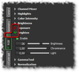In Photivo all filtering is done via the tool pane that is divided in three parts: