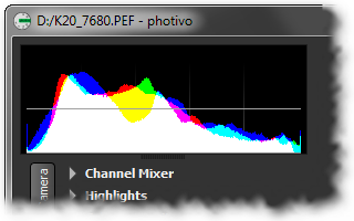 The second interesting context menu option is Selection that lets you restrict the histogram to a certain part of the image. It works similar to crop. You click Selection and when Photivo shows Crop in its status overlay select the relevant part of the image with the mouse. Another click on Selection changes back to normal full-image histogram view.