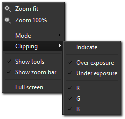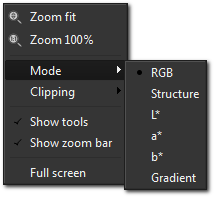 The image area also has a right-click context menu. Two of its sub-menus are especially interesting. Mode puts the image in a variety of specialised display modes. They are informative only, i.e. even when one of them is active while saving the normal RGB picture is saved.