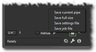 A simple left click on the button triggers the default save action that can be configured in the settings. By default it is set to save the current pipe. A right click on the button opens the save menu.