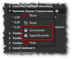 .ptsfiles Photivo saves automatically alongside each output image. These files contain the complete filter chain for that particular picture. If you edit an image and later want to recreate your filters exactly as they were, just load the original image file, then load the settings file and you are back where you left off. - Open preset is a similar function. Presets are basically general purpose settings files where you can store settings for individual filters. For example, if you find a particular setting for the Dynamic Range Compression filter useful in certain situations, right-click on the filter heading and chose Save preset to store the current configuration for this filter. It will automatically show up in the Open preset dialog. The second entry in the right-click menu, Append preset, adds a filter configuration to an existing preset. That way you can build presets that contain the configuration for more than one filter.